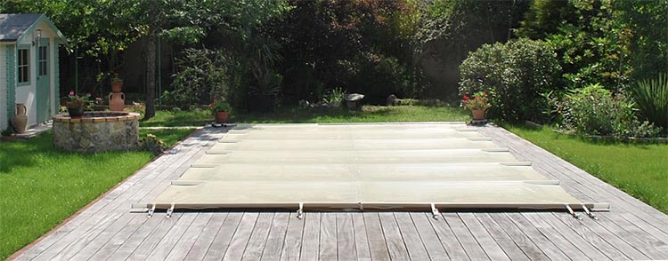 . Equipada con barras transversales y una lona resistente, una cubierta de barras está destinada a impedir el acceso a la piscina